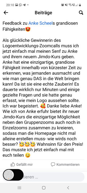Jaaaaa - Das ist soooo genial!!! Bin gerade im aktuellen Kurs von Anke und total begeistert!!!! Seit Jahren!!!! schiebe ich dieses Thema ‚Homepage‘ vor mir her und jetzt geht es unter Ankes Anleitung relativ easy. Sie leitet uns nicht nur im graphischen also optischen Bereich zu optimalem Design, sondern unterstützt uns auch super gut bei den Inhalten und der Gliederung. Also, wenn Du mit dem Gedanken spielst, eine eigene Homepage erstellen zu wollen, dann bist bei Anke definitiv bestens aufgehoben. Ganz klar 10 von 10 Sternen.